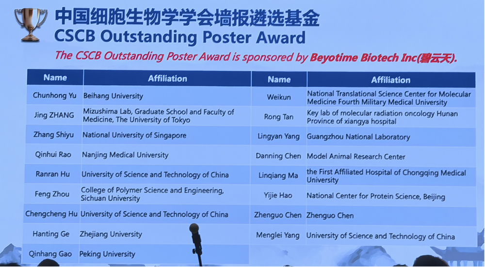 2026年4月8-12日,中国细胞生物学学会2026年全国学术大会在合肥滨湖国际会展中心圆满落幕。本次大会有来自全国各地的2500余名代表参加会议,碧云天作为展商及青年科学家奖和优秀墙报奖的赞助商全程参与。今天小编带领大家来揭秘精彩现场、碧云天青年科学家奖入围者及获奖者以及碧云天优秀墙报遴选。