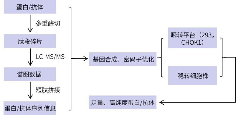 蛋白从头测序结合体外真核重组表达,是获取具有天然修饰与活性的复杂蛋白的关键技术。蛋白从头测序利用高精度质谱仪以及从头测序算法对蛋白进行测序:首先通过酶解获得肽段碎片,再经串联质谱(LC-MS/MS)获得谱图数据,利用从头测序算法获得短肽序列后通过序列拼接完整重构蛋白的一级结构及修饰图谱。该方法是发现新抗体、表征生物药、鉴定疾病标志物,解析保存稀有抗体,纳米抗体等重要手段。
