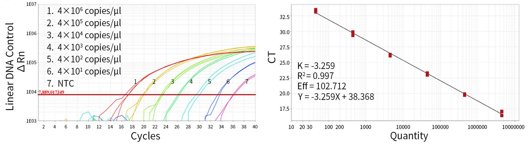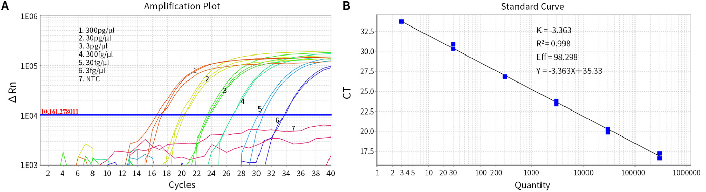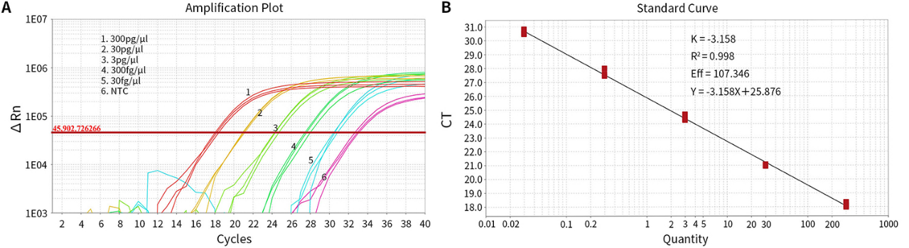 图1:HEK293 DNA残留探针法qPCR检测试剂盒(D7705)用于不同浓度梯度的阳性对照的扩增曲线及标准曲线。