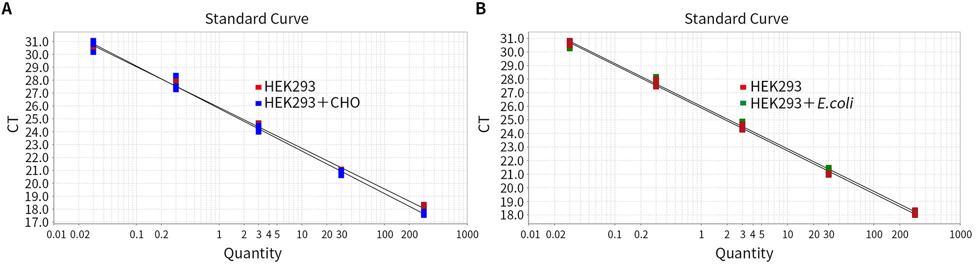 图4.碧云天HEK293 DNA残留探针法qPCR检测试剂盒(D7705)检测不同浓度梯度阳性对照以及分别加入3ng CHO细胞和E. coli基因组DNA的阳性对照的标准曲线。