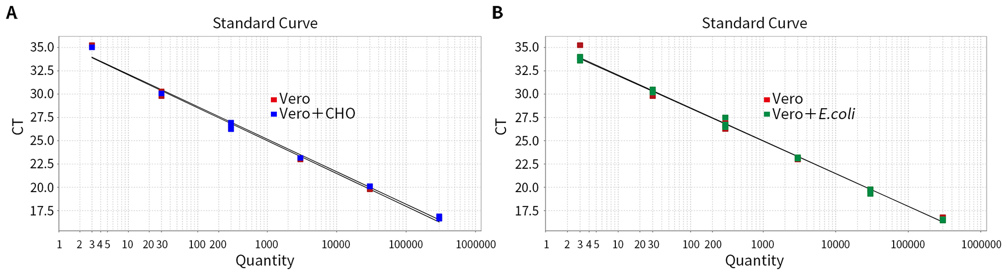图5.碧云天Vero DNA残留探针法qPCR检测试剂盒(D7709)检测不同浓度梯度阳性对照以及分别加入3ng CHO细胞和E. coli细胞基因组DNA的阳性对照的标准曲线。