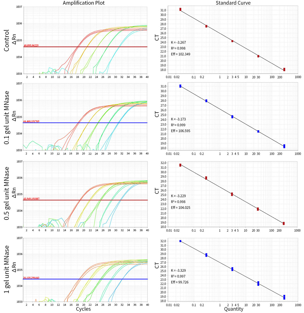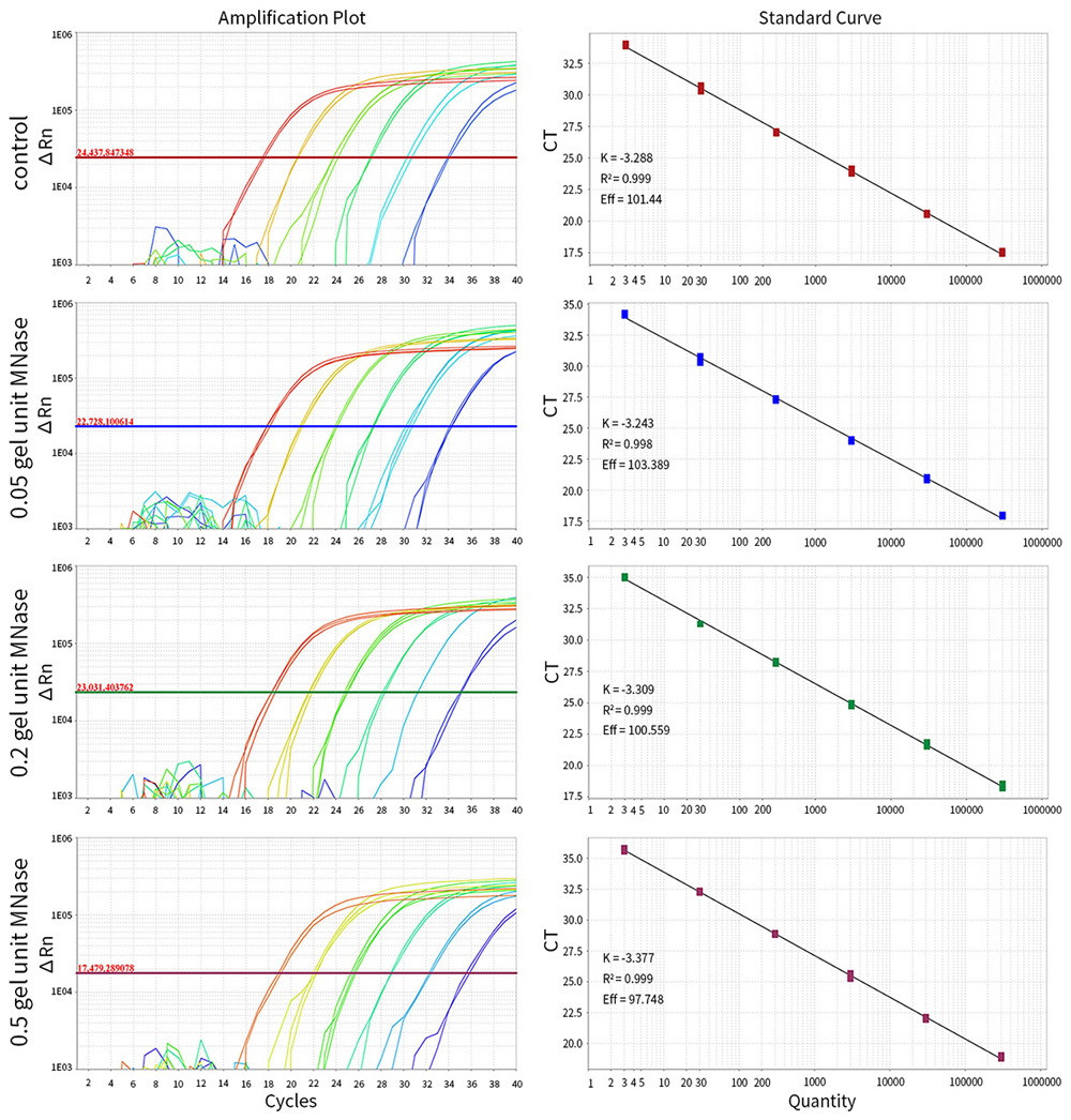 利用不同量微球菌核酸酶(D7201)将HEK293 DNA Control碎片化至不同程度,然后使用本试剂盒进行qPCR检测。结果显示,不同碎片化程度的DNA,基本都会被检测到,不影响检测效果。