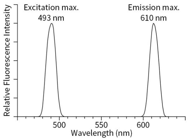 BeyoAIE™ Membrane Red Probe在进入细胞膜之前荧光信号非常弱,在与细胞膜结合前后由于聚集状态的变化其荧光强度会产生极为明显的变化。BeyoAIE™ Membrane Red Probe被激发后可以发出橙红色的荧光,与细胞膜脂质结合后的激发光谱和发射光谱参考图1。其中,最大激发波长为493nm,最大发射波长为610nm。