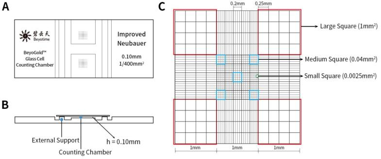 图1.BeyoGold™玻璃细胞计数板(普通款/亮线款)示意图。图A为俯视图;图B为覆盖盖玻片后的侧视图;图C为计数池网格线示意图。
