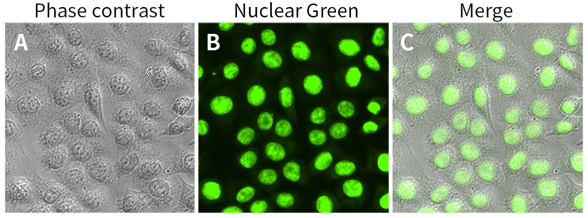 Nuclear Green,也称SYTOX Green,是一种非细胞膜渗透性的花菁荧光染料,不能穿过具有生物活性的细胞质膜,只能穿过死细胞膜的无序区域而到达细胞核,并嵌入细胞的DNA双螺旋形成Nuclear Green-DNA复合物,荧光强度增加500倍以上,从而产生明亮的绿色荧光[1],因此Nuclear Green仅对死细胞染色,被用来区分正常细胞与坏死细胞。Nuclear Green对具有完整细胞膜的正常细胞或凋亡细胞的细胞核染色时需固定和通透处理,然后才能染色。由于Nuclear Green结合DNA的同时也可以结合RNA,所以对细胞核染色时,还需要酌情使用RNase A等先去除RNA,使Nuclear Green仅对DNA染色,从而用于细胞核的染色。