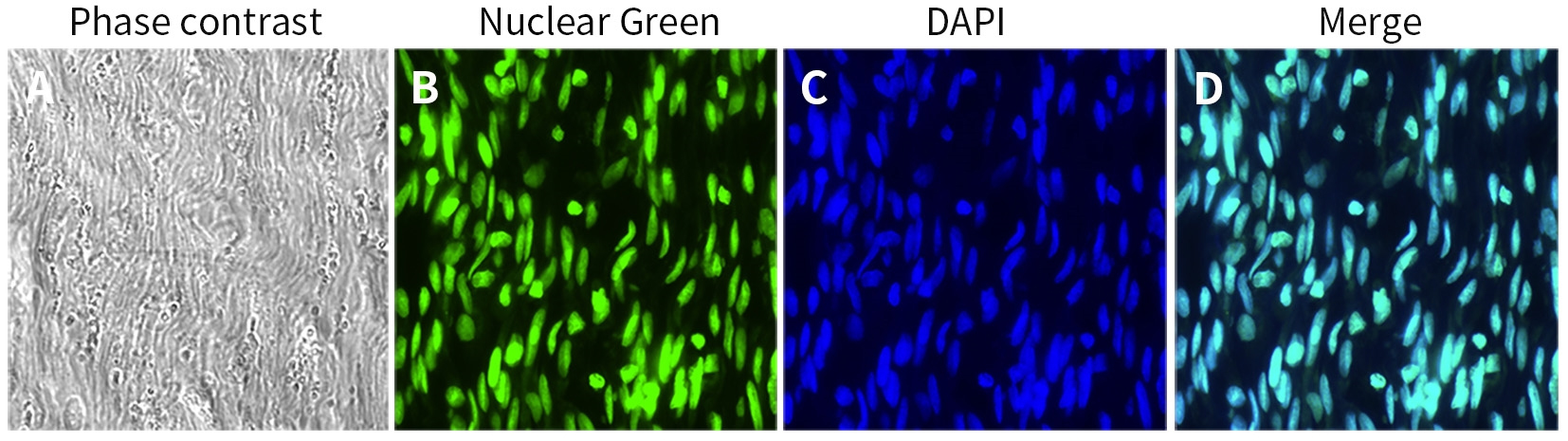 图3.碧云天细胞核绿色荧光染色液(Nuclear Green) (C1186)染色大鼠坐骨神经冰冻切片细胞核的效果。图A为大鼠坐骨神经在明场下的形态图;图B的绿色荧光为Nuclear Green染色的细胞核;图C的蓝色荧光为DAPI染色的细胞核。实际检测效果会因实验条件、检测仪器等的不同而存在差异,图中数据仅供参考。