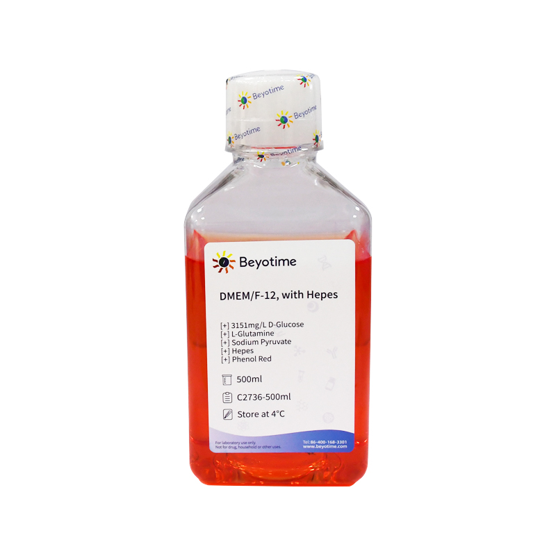 DMEM/F-12,是DMEM与F-12按1:1的比例混合的混合培养液,含有DMEM的高浓度葡萄糖、氨基酸及维生素与F-12的多种组分。DMEM/F-12不含蛋白、脂质和生长因子。因此,DMEM/F-12用于细胞培养时通常须添加适当的补充试剂,如10%胎牛血清(FBS)。DMEM/F-12使用碳酸氢钠缓冲系统(1.2g/L),因此需要5-10%的CO2以维持生理pH值。
