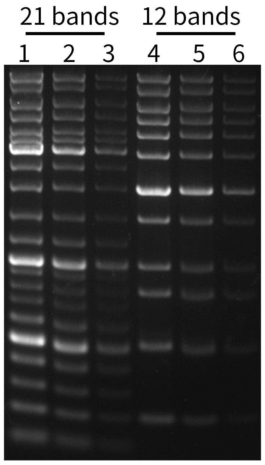图1.碧云天Gel-Red Plus (EB升级换代产品, 10000X) (D0141)用于DNA marker琼脂糖凝胶电泳的效果图。泳道1-3分别为DNA Ladder (0.1-10 kb, 21 bands) (D0107)上样5μl、3μl、1μl的电泳检测效果;泳道4-6分别为DNA Ladder (0.2-12 kb, 12 bands) (D0110)上样5μl、3μl、1μl的电泳检测效果。实际检测效果会因核酸样品种类和大小、电泳槽、核酸染料、电泳条件等的不同而存在差异,图中数据仅供参考。