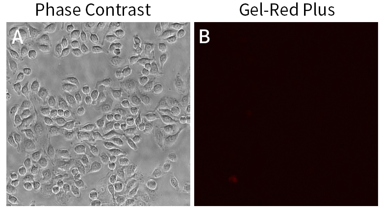 图2.碧云天Gel-Red Plus (EB升级换代产品, 10000X) (D0141)对HeLa活细胞染色效果图。图A为HeLa细胞在明场下的形态图;图B为Gel-Red Plus染色效果图。可见,Gel-Red Plus几乎无法进入活细胞,细胞毒性极低。实测数据会因实验条件、检测仪器等的不同而存在差异,图中数据仅供参考。