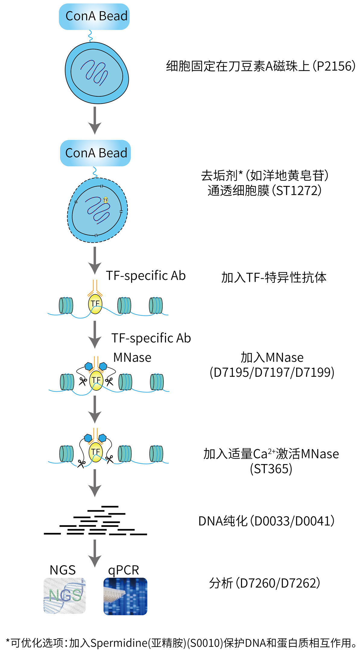 其主要原理是,将细胞固定在刀豆素A磁珠(ConA磁珠)上,然后用去垢剂如洋地黄皂苷(Digitonin)通透细胞膜,加入特异性的一抗和Protein A-MNase或Protein G-MNase,一抗募集pA-MNase或pG-MNase到染色质的靶蛋白上,然后通过适量浓度的Ca2+来激活MNase,利用MNase的酶切特性切割靶蛋白两侧的DNA并释放切割下来的基因组DNA,后续经纯化、富集的切割下来的基因组DNA片段可通过qPCR检测和定量,也可用于二代测序(NGS)分析。