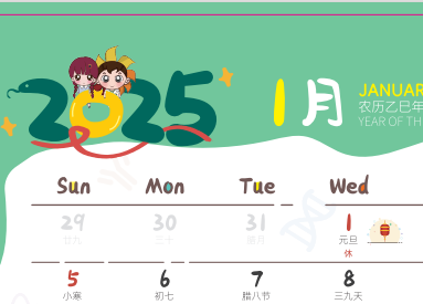 台历整体颜色设计采用的是绿色,较为清新,给人传达出一种平和、安稳、大度的性格;2025年是蛇年,绿色系亦是蛇年吉祥色之一,象征生机勃勃和希望,能够提升属蛇人的感情运势,吸引异性的注意力,同时也有助于事业和财富的提升。