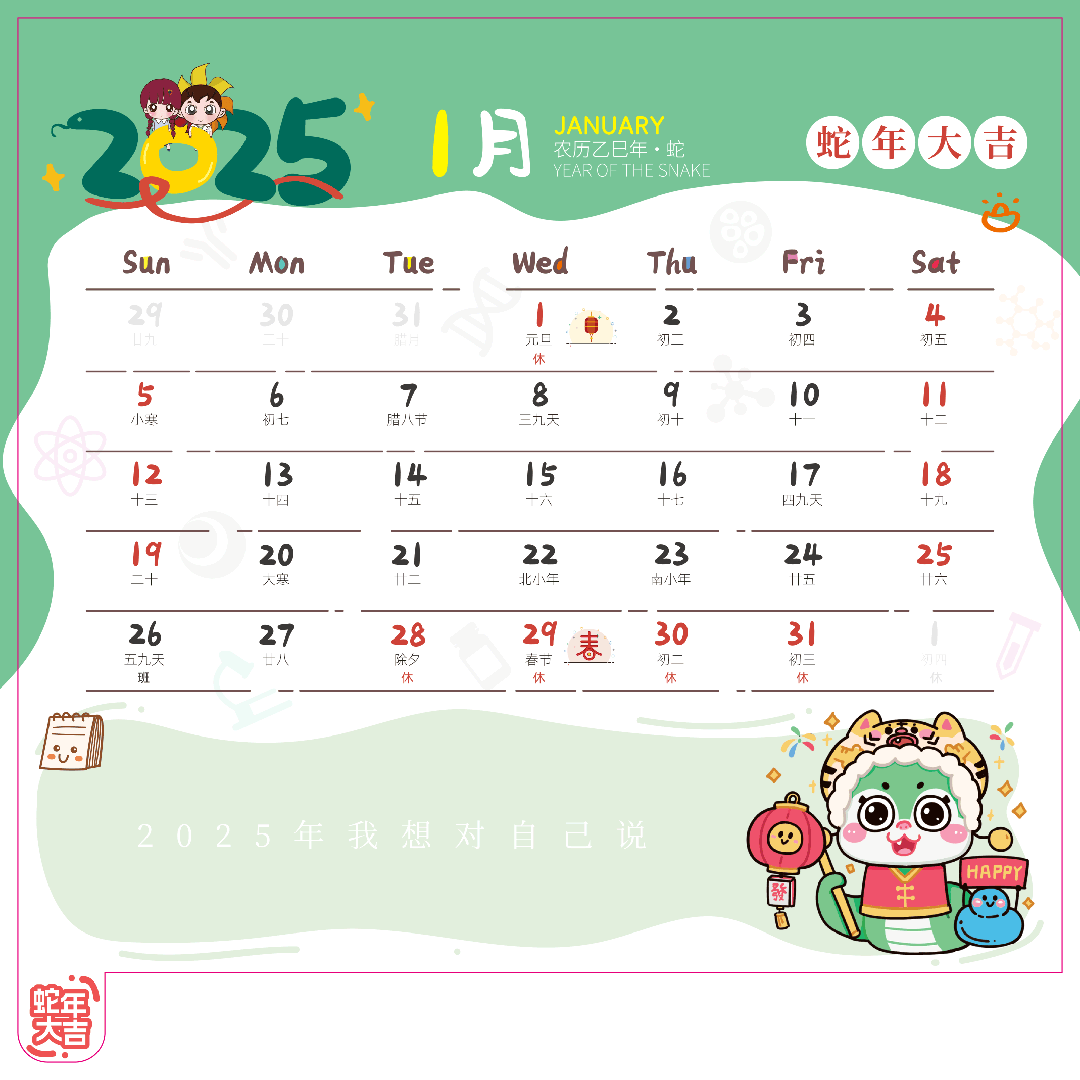台历封面延续着我们永恒的主题“科研顺利”,每一页设计了方便翻阅的小耳朵,每个月的小耳朵都写满了我们的期望,如“蛇年大吉”、“实验顺利”、“数据天天有”、“文章月月出”、“SCI必中”、“顺利毕业”、“早日上岸”、“好运连连”、“研途可期”、“前程似金”、“诸事皆宜”、“富瘦双全”。