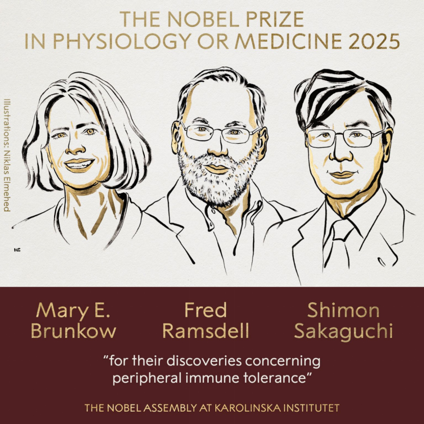 北京时间10月6日,瑞典卡罗琳斯卡学院宣布将2025年诺贝尔生理学或医学奖授予美国的玛丽·布伦科(Mary E. Brunkow)、弗雷德·拉姆斯德尔(Fred Ramsdell)和日本的坂口志文(Shimon Sakaguchi),以表彰他们在“外周免疫耐受”机制方面的突破性发现。