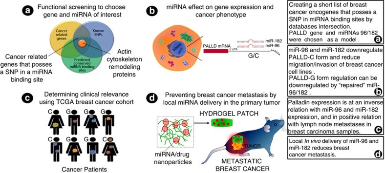 癌细胞转移是女性乳腺癌死亡率的主要原因。由microRNA调控的基因表达对于防止癌细胞的扩散很重要。为了确定在乳腺癌发展中起重要地位,以及可能被用来抑制肿瘤转移的特异性microRNA,研究小组首先进行了大量生物信息学分析。他们比较了三个数据集:一是已知的SNPs;二是通过microRNA与基因组结合的位点;三是已知与细胞运动有关的乳腺癌相关基因。分析显示单核苷酸多态性rs1071738影响癌症转移。这个SNP破坏两个microRNA——miR-96和miR-182的结合。这种破坏防止两个microRNA调控蛋白Palladin的表达。先前的研究已经表明,Palladin在乳腺癌细胞中的迁移以及后续入侵其它健康器官是在乳腺癌形成过程中起着关键的作用。体外实验中发现用miR-96和miR-182能降低Palladin的表达水平,从而降低乳腺癌细胞的迁移和侵袭其它组织的能力。研究人员之后开发了一个递送microRNAs到乳腺癌肿瘤的方法。他们将含有microRNAs的纳米颗粒嵌入水凝胶支架,然后植入小鼠,结果该方法可使microRNAs高效、精确的传递到目标乳腺癌肿瘤部位。为了进一步提高治疗的有效性,研究者们将化疗药物顺铂增加到纳米颗粒上,导致原发肿瘤的生长和转移显著减少。这项研究为实验治疗与传统化疗结合抑制癌症转移提供了新思路。
