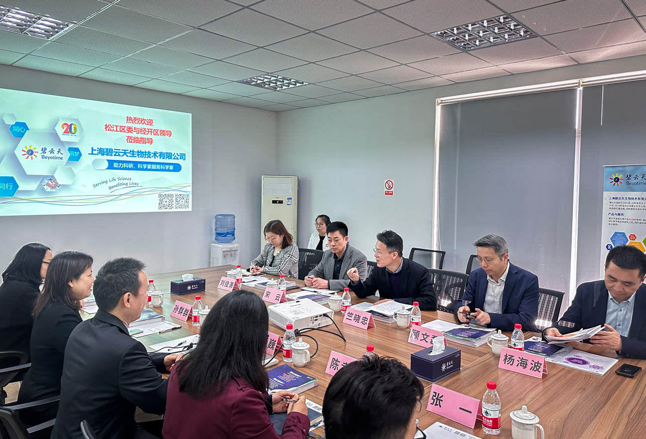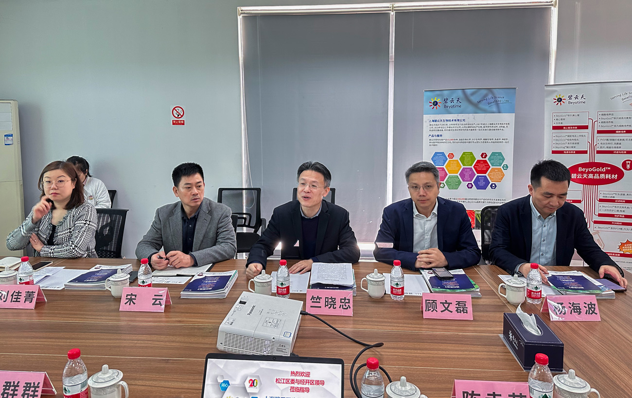 竺晓忠书记一行听取了上海碧云天生物技术有限公司发展历程、人才队伍建设、重点产品的介绍以及后续企业发展方向,对碧云天近年来在公司建设和企业发展等方面的工作表示了肯定。竺晓忠书记表示,碧云天所处的生物医药产业是上海战略性新兴产业的重要支柱,是上海强化高端产业引领功能和科技创新策源功能的重要抓手。希望碧云天能借助新产业园区建设的契机,更上一层楼,助推中国的生物科研事业。在企业未来的发展中,松江区也将做好各项扶持工作,为企业在人才引进、企业用地规划等方面提供优质服务。