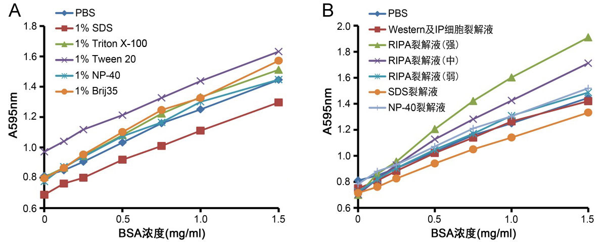 图1. 本试剂盒蛋白标准曲线及其兼容性的实测效果图。A. 本试剂盒对于常见去垢剂的兼容性。B. 本试剂盒对于碧云天的多种裂解液的兼容性。蛋白标准品配制在图中所示的溶液中进行测试。图中数据仅供参考,实际的检测效果可能会略有不同。