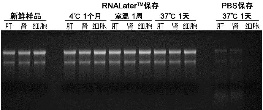 RNALater™对于小鼠组织和HeLa细胞样品的保存效果如图1所示。组织和细胞用RNALater™分别在4℃保存1个月、室温保存1周以及37℃保存1天后,抽提获得的RNA与新鲜样品一样均能够保持完整性;而用PBS在37℃保存1天后,大部分RNA都已经被降解。