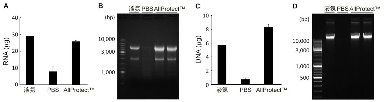 图2.小鼠肝组织在不同保存条件下的RNA、DNA的抽提效果对比。各组样品均约10mg,25℃分别用PBS和AllProtect™保存,或者液氮冻存,7天后分别使用碧云天的RNAeasy™动物RNA抽提试剂盒(离心柱式)(R0026)和基因组DNA小量抽提试剂盒(离心柱式)(D0063)进行RNA和DNA抽提。A. 各组抽提获得RNA量的柱状图。B. 抽提获得的RNA样品的电泳图,各组均上样2µl洗脱下来的RNA样品(除PBS组外,每组约1.0µg RNA),并用1.2%甲醛变性琼脂糖凝胶进行电泳检测。本图中使用的是DNA marker。C. 各组抽提获得DNA量的柱状图。D. 抽提获得的DNA样品电泳图,各组均上样2µl洗脱下来的DNA样品(除PBS组外,每组约300ng DNA),并用1.0%琼脂糖凝胶进行电泳检测。