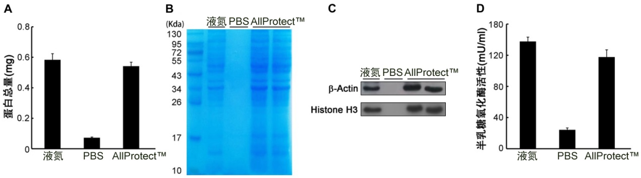 图3.小鼠肝组织在不同保存条件下的总蛋白抽提效果对比。各组样品均约10mg,25℃分别用PBS和AllProtect™保存,或者液氮冻存,7天后分别使用碧云天的Western及IP细胞裂解液(P0013)进行总蛋白抽提。A.各组抽提获得的蛋白总量柱状图。B.抽提获得的蛋白样品SDS-PAGE电泳后的考马斯亮蓝染色图,各组按照约30µg蛋白上样(PBS组除外),并利用12% SDS-PAGE凝胶进行电泳和染色检测。C.Western blot检测各组β-Actin和Histone H3的表达情况。D.利用半乳糖/半乳糖氧化酶检测试剂盒测得的半乳糖氧化酶活力柱状图。