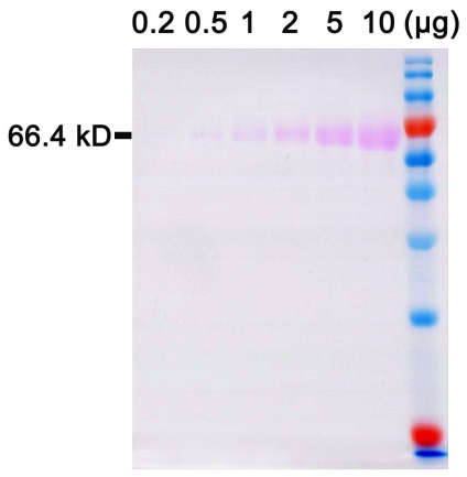 图1. 使用InstantView™ SDS-PAGE蛋白染色及上样缓冲液(5X)对不同上样量的BSA样品染色电泳后的凝胶照片。0.2、0.5、1、2、5、10μg的BSA蛋白样品与适量InstantView™ SDS-PAGE蛋白染色及上样缓冲液(5X)混合后,100℃水浴煮沸5分钟,上样进行SDS-PAGE后凝胶的实拍图片,其中0.5μg蛋白条带肉眼清晰可见,0.2μg蛋白条带肉眼也隐约可见。
