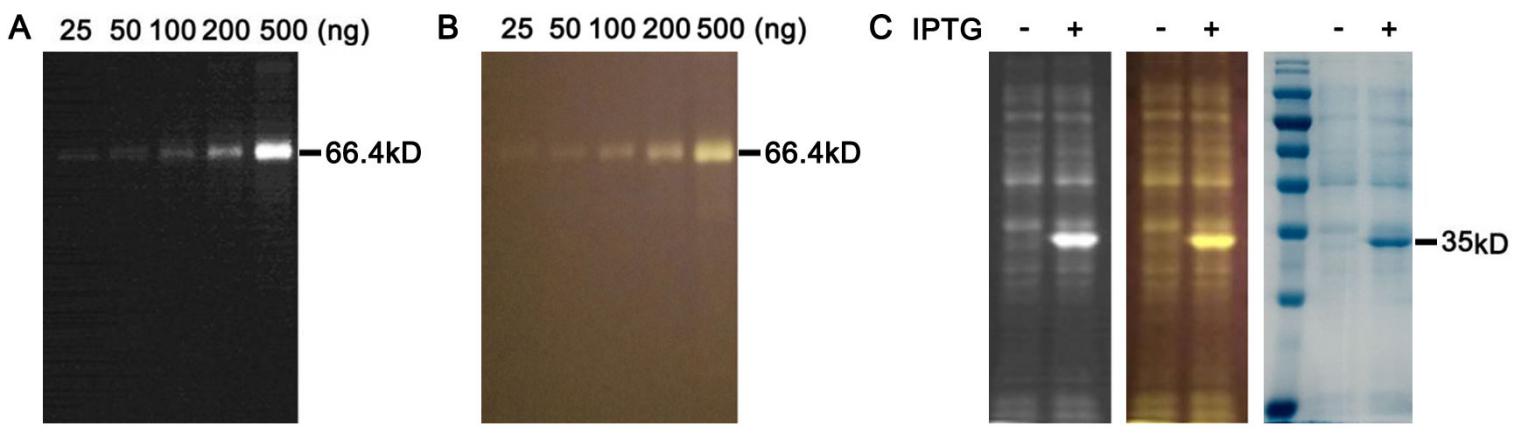图2. InstantView™ SDS-PAGE蛋白染色及上样缓冲液(5X)对不同上样量的BSA样品和菌液样品染色电泳后用紫外或蓝光成像设备的检测效果图。A, B. 25、50、100、200和500ng的BSA样品与适量InstantView™ SDS-PAGE蛋白染色及上样缓冲液(5X)混合后,100℃水浴煮沸5分钟,上样进行SDS-PAGE后凝胶使用紫外(A)和蓝光成像设备(B)的实拍图片,其中25ng蛋白条带都清晰可见;C. 取10μg用IPTG诱导表达前和诱导表达35kD目的蛋白后的细菌裂解液与适量InstantView™ SDS-PAGE蛋白染色及上样缓冲液(5X)混合后,100℃水浴煮沸5分钟,上样进行SDS-PAGE后,凝胶直接使用紫外(左)、蓝光成像设备(中)的实拍图片和考马斯亮蓝染色(右)后的实拍图片,其中诱导表达的35kD蛋白条带清晰可见。图中可见考马斯亮蓝染色的灵敏度显著低于本产品。