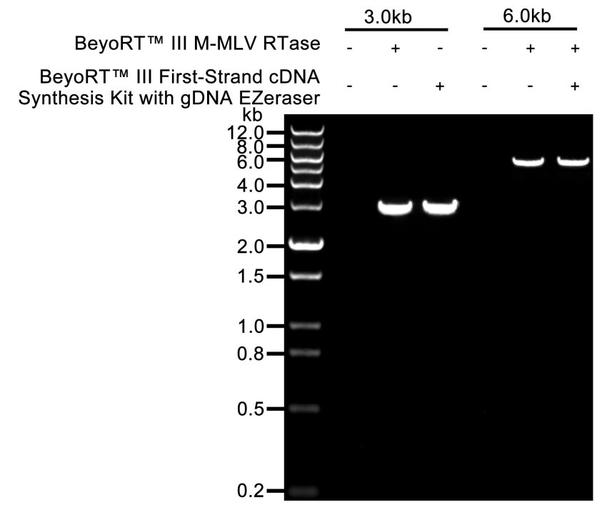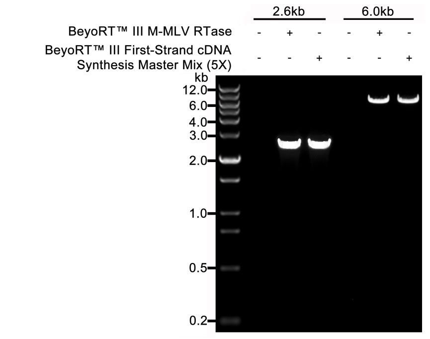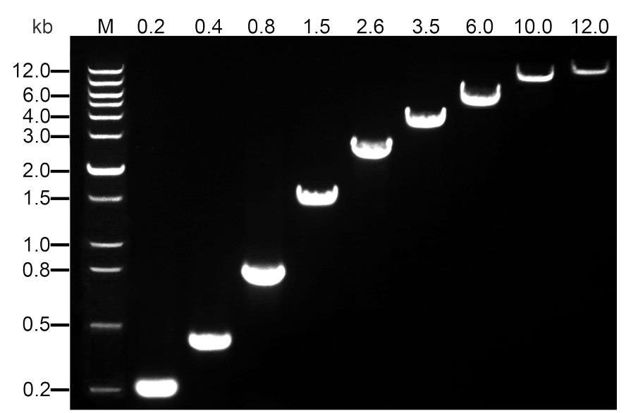 图1. 使用BeyoRT™ Ⅲ M-MLV反转录酶反转录总RNA后,对于不同长度的cDNA进行PCR扩增后的电泳效果图。图中可见0.2-12kb的cDNA可以非常高效地被反转录。