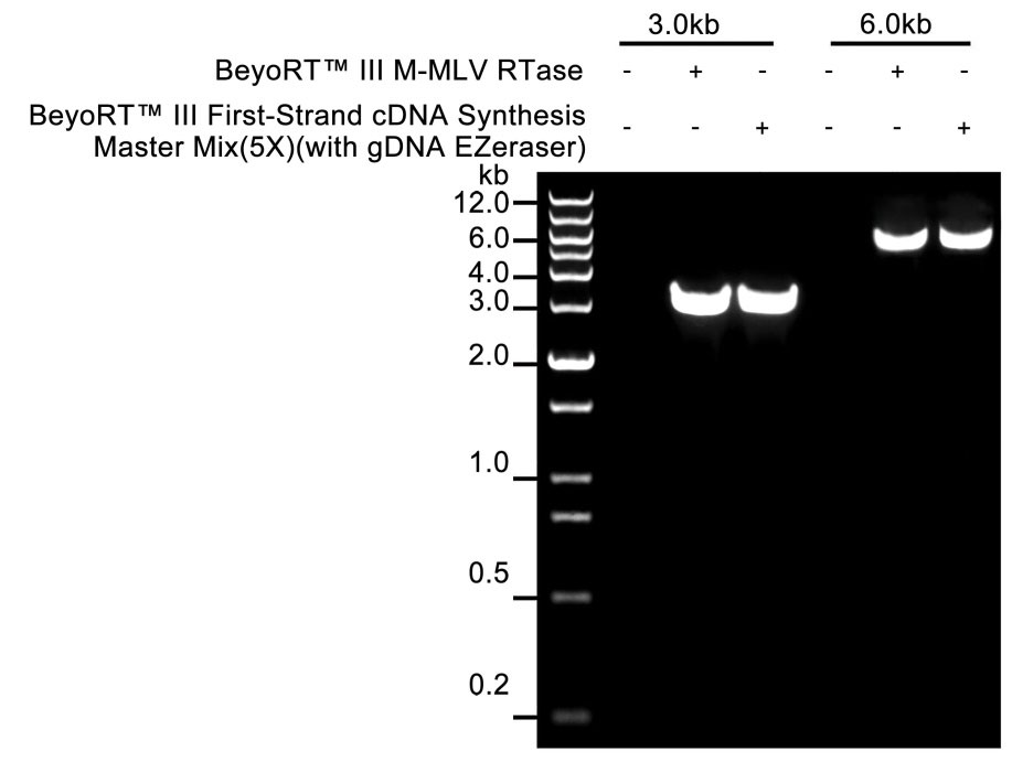 图5 使用碧云天的BeyoRT™ Ⅲ cDNA合成预混液(5X) (with gDNA EZeraser)和使用BeyoRT™ III M-MLV反转录酶的常规反转录体系的效果对比图。在20μl的反转录反应体系中,以HEK293T细胞中提取的1µg总RNA为模板,没有加入反转录酶、分别使用BeyoRT™ Ⅲ M-MLV反转录酶的常规反转录体系和BeyoRT™ Ⅲ cDNA合成预混液(5X) (with gDNA EZeraser),42℃反转录60min。然后取1μl反转录产物分别进行两个目的基因(3.0kb的Fibrillin1基因和6.0kb的ADAR1基因)的PCR扩增和电泳检测。