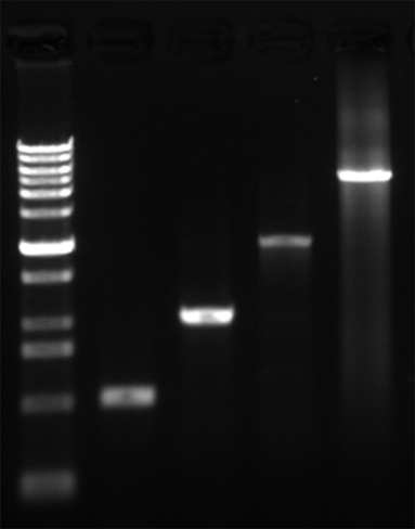 图2. 不同长度的PCR产物样品使用D0076 InstantView™红色荧光DNA上样缓冲液(6X, 溴酚蓝),并使用InstantView™红色荧光DNA Ladder (D0120S)的电泳效果图。