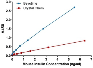 图1. 碧云天Mouse Insulin ELISA Assay Kit (Ultrasensitive)和Crystal Chem的Ultrasensitive Mouse Insulin ELISA Kit检测效果对比图