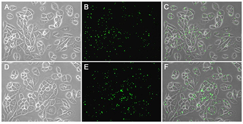 图1. LipoRNAi™转染试剂转染FITC标记的STIM1-siRNA至Hela细胞(A-C)或NIH3T3细胞(D-F)后4h的实拍图片。FITC标记的 STIM1-siRNA均黏附于细胞膜上或已通过内吞(endocytosis)的方式进入细胞。 A、B和C分别为Hela细胞的明场图片、荧光图 片和两者的叠加图片。D、E和F分别为NIH3T3细胞的明场图片、荧光图片和两者的叠加图片。NIH3T3细胞和Hela细胞均接种于六孔板,转染时每孔加入100pmol FITC标记STIM1-siRNA和4μl LipoRNAi™转染试剂的混合物。