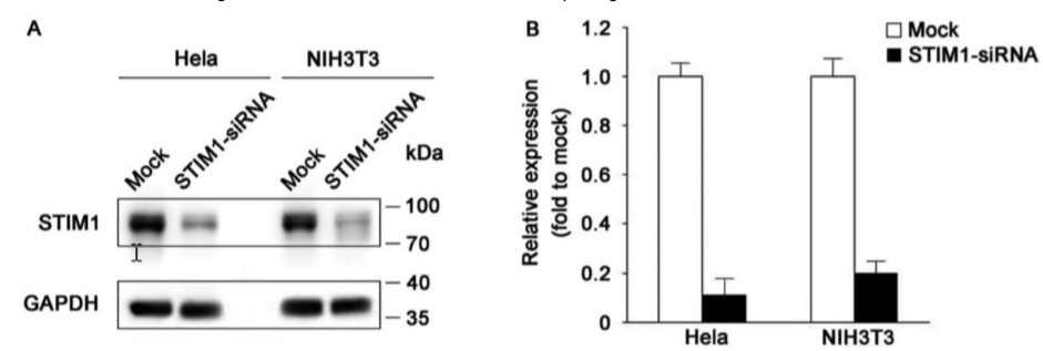 图 2. LipoRNAi™转染试剂转染 FITC 标记的 STIM1-siRNA 至 Hela 或 NIH3T3 细胞 48h 后,通过 Western blot 检测 STIM1 蛋白的下调效果。GAPDH 为内参。A 为 Western blot 的检测结果;B 为 A 图及重复实验的灰度定量统计图。