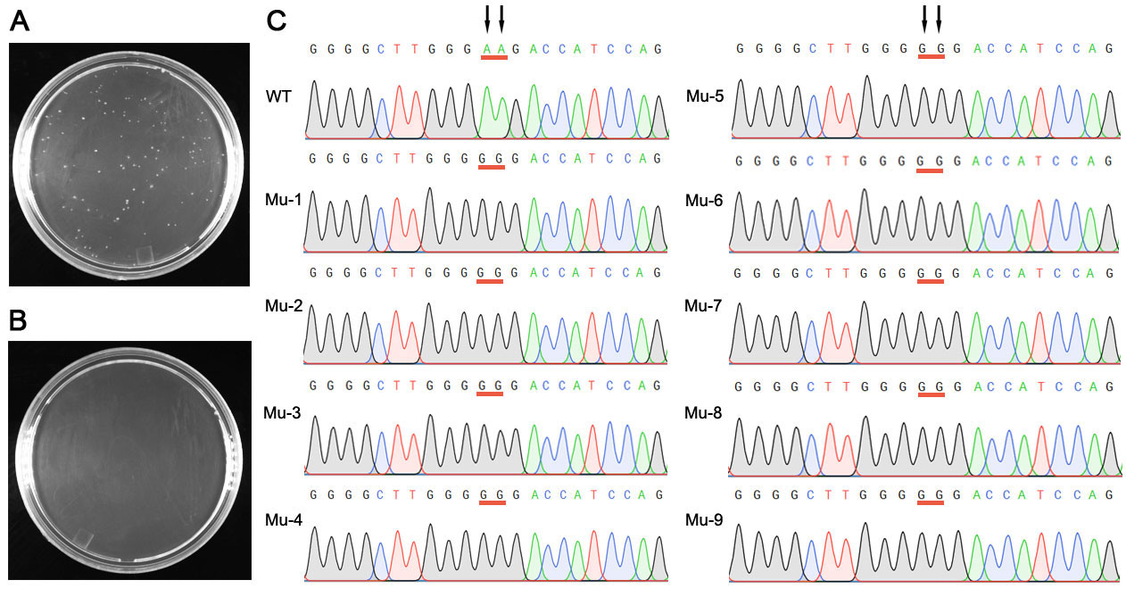 图1.对 pcDNA3.1-SRCAP(14566bp)质粒进行点突变的实际效果图。A. 使用本试剂盒进行点突变获得的LB平板照片。B. 阴性对照LB平板照片。与A相比没有添加BeyoAmp™ Extra-long DNA Polymerase。C. 突变前后的测序图。箭头所示为拟突变的两个位点,红色下划线的为突变前和突变后的碱基。