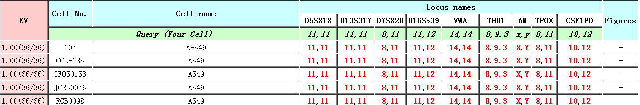 图2. A549人非小细胞肺癌细胞STR分析结果