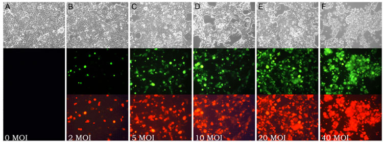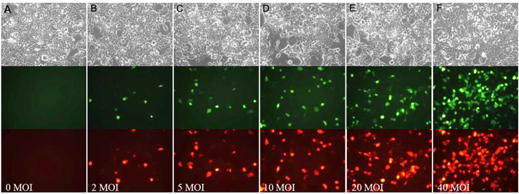 图1. Ad-mCherry-GFP-LC3B感染NIH3T3细胞的效果图。A、B、C、D、E和F依次为Ad-mCherry-GFP-LC3B分别在MOI值为0、2、5、10、20和40时感染NIH3T3细胞48h后的实拍效果图。