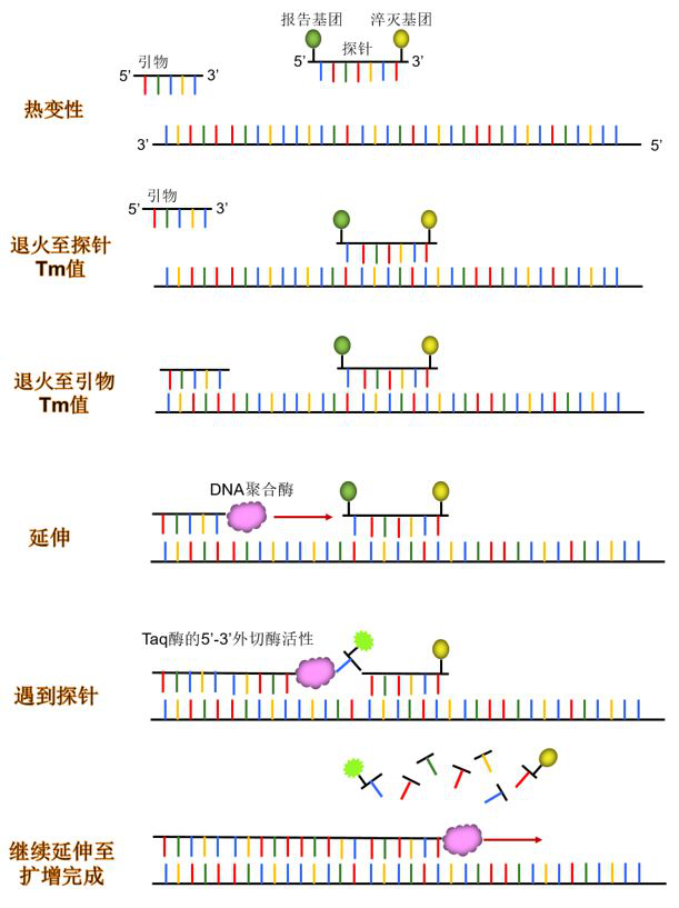 一般使用的探针法即为TaqMan探针,TaqMan 探针是一段寡核苷酸单链,与目标DNA互补,探针两端分别有一个报告基团和一个淬灭基团,探针完整时,报告基团发射的荧光信号被淬灭基团吸收,不会检测到荧光,PCR扩增时,Taq DNA聚合酶的5'-3'外切酶活性将探针酶切降解,使报告荧光基团和淬灭荧光基团分离,报告基团释放并发出荧光。每合成一条DNA链,就会切断一条探针,并产生一个单位荧光信号,信号的强度与结合到DNA链上的探针成正比。