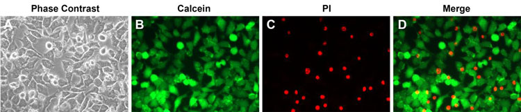 图2. Calcein AM细胞活性检测试剂盒与碘化丙啶(Propidium Iodide, PI)联合使用检测L-929活细胞与死细胞的效果图。