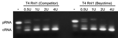 图1.碧云天生产的T4 RNA Ligase 1和N公司同类产品(Competitor T4 RNA Ligase 1)催化5'磷酸化3'羟基的单链RNA (pRNA-OH)环化连接生成环状RNA (circular RNA, cRNA)的效果图。使用本产品或国外N公司的T4 RNA Ligase 1,20μl 反应体系底物终浓度为0.5μM,37℃孵育30min进行连接反应,反应完毕后在65℃孵育15min终止反应,立即取样用15%尿素(7M)变性聚丙烯酰胺凝胶在冰水浴中进行电泳,最终进行核酸染色和荧光成像分析。如图所示,本产品与N公司的产品相比,同样具有良好的催化效果。