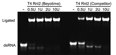 图2. 碧云天生产的T4 RNA Ligase 2和N公司的同类产品(Competitor T4 RNA Ligase 2)催化连接dsRNA粘端连接的效果图。 RNA-1:5’-OH-GGGCUUUGCGUGGGUUU-OH-3’;RNA-2 (5’端磷酸化):5’- pCUAUAGAAACCCACGCAAAGCCC-OH-3’,使用碧云天的R0051 Annealing Buffer for RNA oligos (5X),参考说明书进行退火反应。退火获得的dsRNA,在20µl反应体系中加入图中指定量的本产品或国外N公司的T4 RNA Ligase 2 (T4 Rnl2),37℃孵育30min进行连接反应,反应完毕后立即取样用15%非变性聚丙烯酰胺凝胶进行电泳分析。如图所示,本产品与N公司的产品相比,实际的连接效率约为N公司产品的2倍,在本反应体系中碧云天生产的T4 RNA Ligase 2仅需0.5U即可完成大部分连接反应,2U就可以非常充分地完成连接反应。