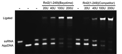 图3. 碧云天生产的T4 RNA Ligase 2, truncated和N公司的同类产品(Competitor T4 RNA Ligase 2, truncated)催化连接AppDNA和ssRNA的效果图。使用本产品或国外N公司的T4 RNA Ligase 2, truncated,即T4 Rnl2(1-249),在20µl反应体系中加入图中指定量的本产品或国外N公司的T4 Rnl2, truncated,25℃孵育60 min进行连接反应,反应完毕后立即取样在65℃孵育20 min终止反应,加入变性上样缓冲液,在95℃孵育5 min后放至冰浴中,随后用15%尿素(7M)变性聚丙烯酰胺凝胶进行电泳分析,最终进行核酸染色和荧光成像分析。如图所示,本产品与N公司的产品相比,具有同样良好的催化效果。