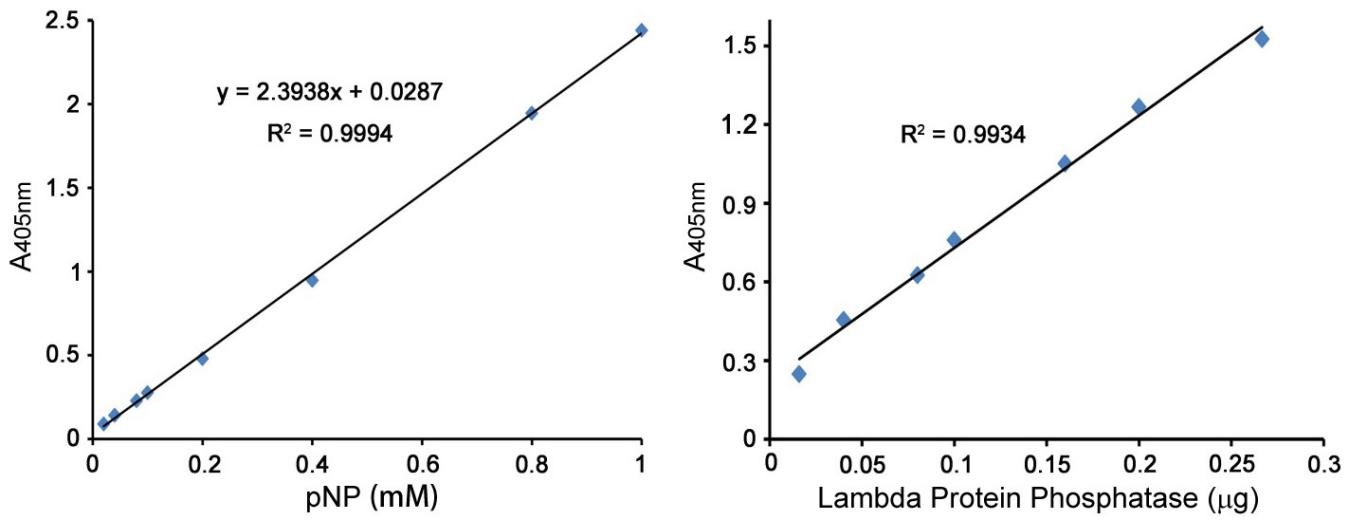 图1. Lambda Protein Phosphatase酶活测定实验图。左图:pNP标准曲线。右图:Lambda Protein Phosphatase按照30、40、50、80、100、200、500倍稀释后,在50µl反应体系中的酶量分别为0.27µg、0.20µg、0.16µg、0.10µg、0.08µg、0.04µg、0.016µg,并与100mM pNPP在1×Lambda Protein Phosphatase Buffer和1×MnCl2中在30℃反应5min后,加入12.5µl 3M NaOH终止反应,测定产生的pNP在405nm吸光度,并根据pNP标准曲线,计算Lambda Protein Phosphatase酶活性。不同批次检测出来的酶活性会略有差别。