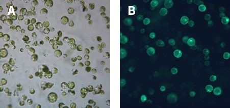 图1. 使用碧云天植物原生质体转染试剂盒(Plant Protoplasts Transfection Kit)转染拟南芥原生质体的效果图。在2ml的圆底离心管(FTUB019)中加入20μg p35SPPDK-EGFP-Flag (植物用绿色荧光蛋白) (D2627),加入100μl制备好的原生质体,轻柔混匀后加入110μl当日配制好的转染试剂溶液,轻柔混匀,室温静置5min后加入440μl终止液,轻轻颠倒混匀,室温100g离心1min,去除上清,再加入0.5ml终止液,轻柔重悬原生质体,室温100g离心1min后,尽量去除上清,收集原生质体。加入1ml培养液,小心重悬原生质体后将其平置25℃培养过夜(约16h),次日于荧光显微镜下检测EGFP荧光信号。上图为实际检测的明场(A)和荧光照片(B)。