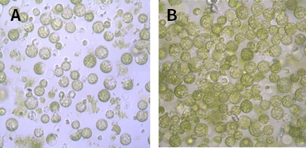 图2.碧云天生产的植物原生质体分离试剂盒(Plant Protoplasts Isolation Kit)分离制备的拟南芥原生质体效果图。生长状态良好的拟南芥叶片20片,去除叶片的尖端与基部,用刀片(FS205)切成0.5-1mm小条,浸入配制的细胞壁消化液中,真空干燥器抽真空30min,避光条件下消化3h后,轻轻摇动并吸取少量消化液在光学显微镜下观察游离的原生质体(图A)。消化比较充分后,将所得原生质体溶液用1X Dilution Buffer进行等体积稀释,再用70μm孔径的细胞过滤器(FSTR070)过滤所获得的原生质体溶液,以去除未消化完全的叶片,室温下100g离心1min,去除上清,将其重悬于500μl Resuspension Buffer中,吸取100μl重悬的原生质体,光学显微镜下观察原生质体的数量与形态(图B)。实际的检测效果会因检测条件的不同而存在差异,本图仅供参考。