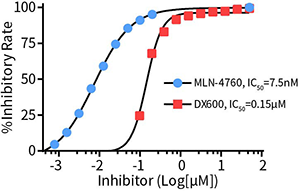 图2. 血管紧张素转换酶2 (ACE2)抑制剂筛选试剂盒检测ACE2抑制剂MLN-4760和DX600的效果图。实际检测结果可能会因样品和检测条件等的不同而存在差异,图中数据仅供参考。