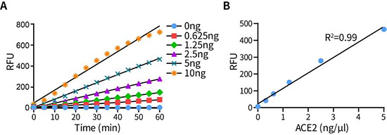 图2. Recombinant Human ACE2 Protein (hFc Tag)酶切MCA-APK(Dnp)-OH底物的效果图。图A为0-60分钟内,不同量的ACE2酶切MCA-APK(Dnp)-OH生成MCA产物的荧光强度。图B为不同量的ACE2与MCA-APK(Dnp)-OH底物在37℃孵育1小时,生成MCA产物的荧光强度。实际检测结果可能会因样品和检测条件等的不同而存在差异,图中数据仅供参考。