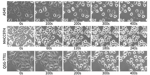 图1. BeyoAOF™重组胰酶细胞消化液消化不同细胞的效果图。用BeyoAOF™重组胰酶细胞消化液分别消化A549、MHCC97H、QSG-7701细胞,在1-2分钟内,显微镜下可观察到细胞边缘明显收缩,紧密贴合的细胞离散成单个细胞。