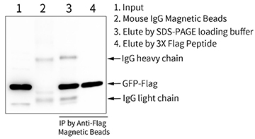 本试剂盒提供三种洗脱方法 本试剂盒提供Flag多肽、酸性和SDS-PAGE上样缓冲液洗脱液进行洗脱。特别是Flag多肽洗脱后不会包含抗体的轻链和重链,可以有效解决免疫沉淀后Western实验中轻链和重链的干扰问题。