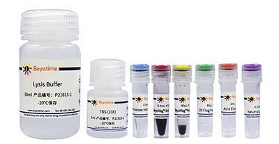 本试剂盒包含高质量的BeyoMag™ Anti-Flag Magnetic Beads (Anti-Flag磁珠)、BeyoMag™ Mouse IgG Magnetic Beads (小鼠IgG磁珠,作为阴性对照)及优化的各种缓冲液如Lysis Buffer、TBS (10X)、Protease Inhibitor Cocktail (100X)、3X Flag Peptide (25X)、Acid Elution Buffer、Neutralization Buffer、SDS-PAGE Sample Loading Buffer (5X)等免疫沉淀必要试剂,使免疫沉淀或免疫共沉淀实验更加简单、便捷、高效。