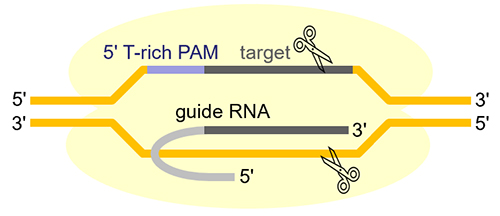 CRISPR-Cas12a系统是由Cas12a和gRNA (crRNA,仅需约40-44个碱基)组成。FnCas12a由gRNA引导至互补链,识别互补链上5'端富含T碱基(5'-TTN-3')的PAM (Protospacer adjacent motif)序列,然后Cas12a中的RuvC核酸内切酶结构域逐个切割互补链和靶链,以产生交错的DNA双链断裂,断裂发生在PAM序列3'端的约第18个碱基处,切割产物为5'端突出4或5个碱基的粘性末端(图1)。而CRISPR-Cas9系统是由Cas9和gRNA (crRNA和tracrRNA两个RNA分子融合而成)组成,Cas9在gRNA的引导下,识别3'端富含G碱基(5'-NGG-3')的PAM序列,并且Cas9需要使用HNH和RuvC两个核酸酶结构域协同切割DNA,断裂通常发生在PAM序列5'端的第3个碱基处,最终产生平末端。
