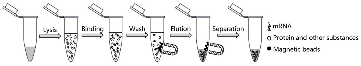 图1. BeyoMag™ Oligo (dT)25 Magnetic Beads (mRNA磁珠) (R0075)用于mRNA抽提的工作原理示意图。