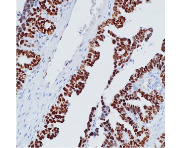 Immunohistochemistry of formalin fixed paraffin embedded human ovarian cancer using BeyoIHC™ WT1 monoclonal antibody at dilution of 1:200.